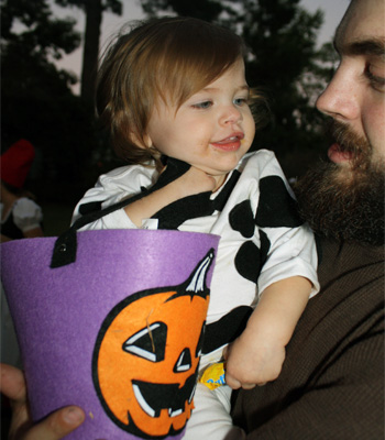 For the second year in a row, both families came to our house. (We are lucky enough to have our own built in candy passer outers! Thanks Ang + Judah!) Our street is where everyone comes for Halloween. They block off the roads and thousands of kids and families show up. It's kind of magical to watch. Last year Dakota was only barely 3 months old, so things were very different this year than last year. Different in a good way! After pushing her around in her car for all of 3 houses, and carrying her up to a few, she quickly got the hang of it herself. Picture a tiny baby running up to houses with a basket in one hand, the other hand open wide just anticipating getting her share of candy. It was extremely cute. I loved watching her get so excited.